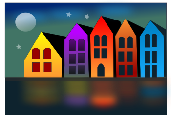 This features a nighttime scene with five different colored houses lined up along the edge of a canal. Each house has a unique color, making for an interesting and vibrant display. The reflections of these houses can be seen in the water, adding depth to the scene. In addition to the houses, there are several stars visible in the sky, creating a sense of wonder and tranquility. Overall, this illustration captures a serene nighttime atmosphere with a touch of whimsy from the colorful houses.