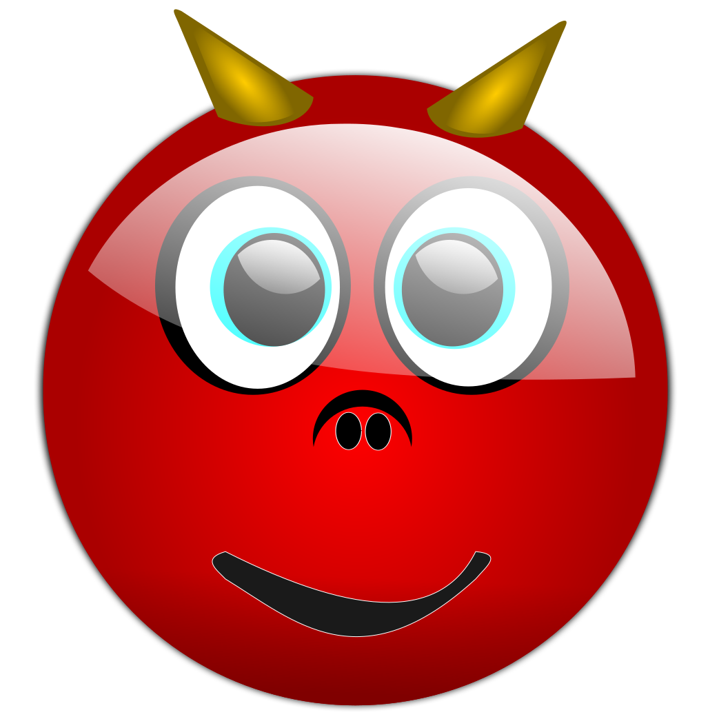 This features a red devil face with blue eyes and horns, giving it an evil appearance. It has a big smile on its face, making it look friendly despite its demonic appearance. The devil's face is the main focus of the image, occupying most of the frame.