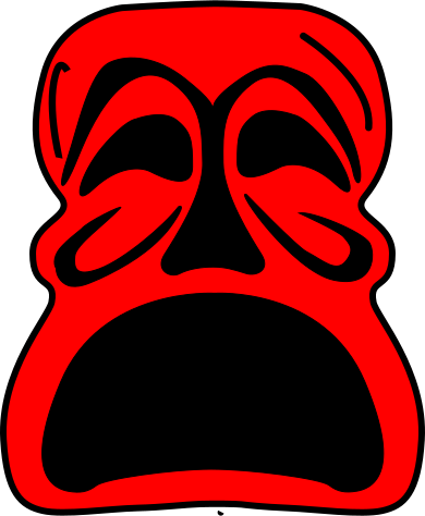 This features a large, red and black mask with an angry expression. It is reminiscent of a traditional Japanese theatre mask, but has been given a modern twist by being drawn in a more cartoon-like style. The mask's design includes two prominent eyes, one on the left side and another on the right, as well as a mouth that appears to be frowning or making an angry face. The overall effect is a striking visual representation of emotion, with the bold colors and exaggerated features creating a powerful impression.