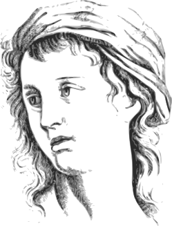 This is a drawing of a woman with long hair, wearing a headband. She appears to be looking downward and has a thoughtful expression on her face. The drawing is in black and white, giving it an artistic and timeless appearance. It seems to be a portrait or a representation of a person from the past, possibly inspired by a famous artist's work.