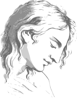 This is a drawing of a woman with long hair, looking downward. She has a thoughtful expression on her face as she gazes at the ground. The drawing appears to be an interpretation from an original drawing by Charles Lebrun, which was published in "L’Encyclopédie ou Dictionnaire raisonné des sciences, des arts et des métiers" (le dessein) from Diderot and D'Alembert in 1751. The woman's hair is styled in a braid, adding to the elegance of her appearance.