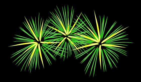 This features a black background with three yellow fireworks exploding in the air. Each firework is positioned at different angles, creating an interesting visual effect. The fireworks are located towards the top of the image and appear to be bursting simultaneously, adding a sense of motion and excitement to the scene.