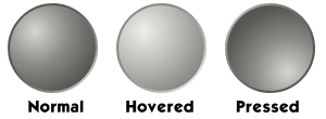This displays three round buttons with different shapes and labels. The first button is labeled "normal," the second one has a hovered shape, and the third one is pressed. These buttons are arranged in a row on top of each other, creating an organized appearance. Each button's label is written in white text, making it easy to read and understand their purpose. This image could be used for various purposes such as a user interface or a visual aid for explaining different states of a system.