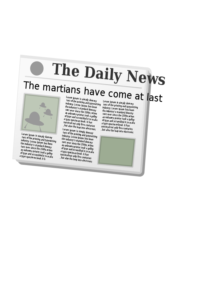 This features a newspaper headline that reads "The Daily News: The Martians have come at last." This suggests an interesting and possibly fictional story about the arrival of aliens. The newspaper is displayed in a white background, which emphasizes its title and content. The headline is placed on top of the paper, drawing attention to it as the main focus of the image.