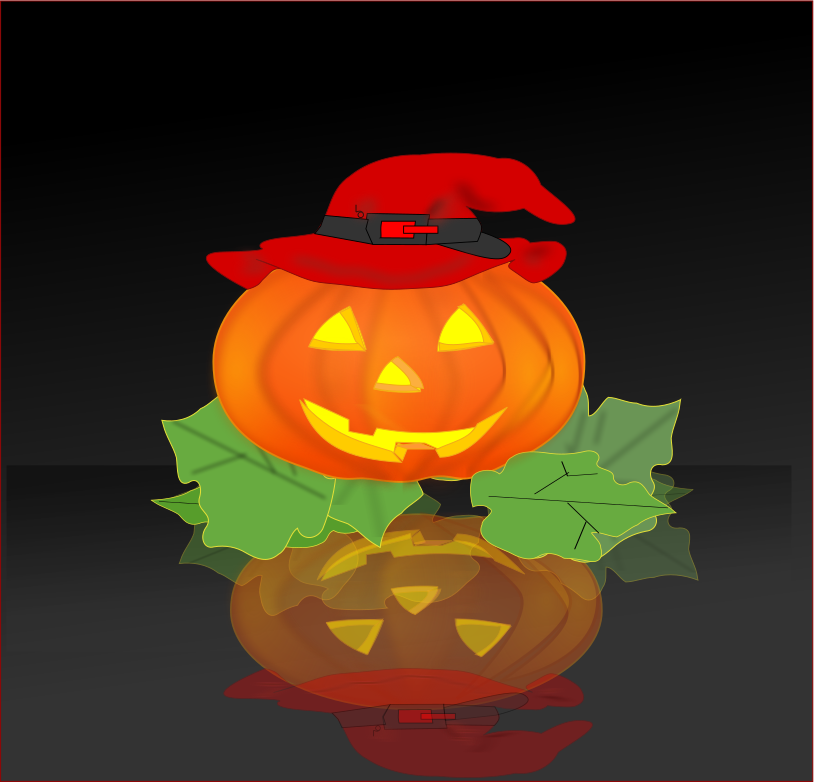 This features a pumpkin with a red hat and green leaves, sitting on top of a table. It appears to be a decorative jack-o'-lantern, which is typically associated with the Halloween holiday. Jack-o'-lanterns are carved from pumpkins and have a monstrous face carved onto their surface. The inside flesh is removed, and a light is placed inside to illuminate the effect at night. In this case, the jack-o'-lantern has been creatively decorated with a red hat and green leaves, adding an extra touch of festivity to its appearance.