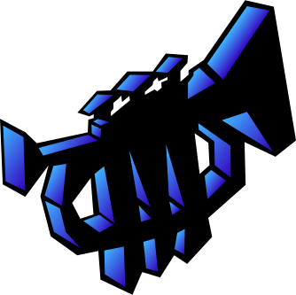 This features a stylized blue and black drawing of a trumpet. The trumpet is depicted in various positions, including one where it appears to be pointing upwards. The overall design gives the impression that the trumpet is made out of interconnected squares or blocks. This unique artistic representation of a trumpet adds an interesting visual element to the image.