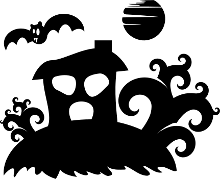 This features a black silhouette of a house with a spooky appearance, sitting on top of a hill. Next to the house, there are two trees that add to the overall ambiance of the scene. Above the house, there is a full moon in the sky, and a cloud partially covers it. Additionally, a couple of bats can be seen flying around the area, adding to the eerie atmosphere. The combination of these elements creates an intriguing and mysterious image that captures the viewer's attention.