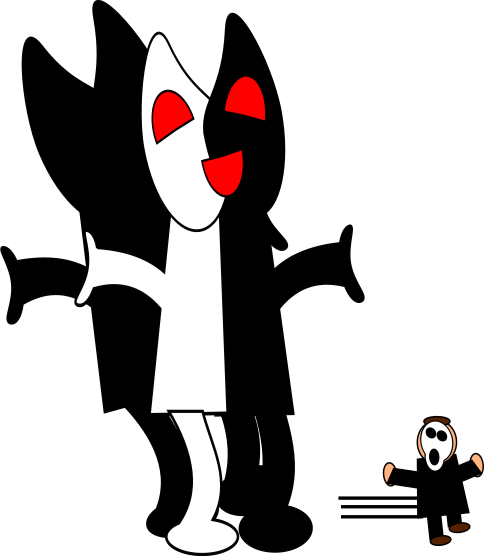 This features a large, colorful cartoon character with a wide smile and two red eyes. This character is standing next to a smaller figure of a person who appears to be screaming or making a funny face. The larger character seems to be interacting with the smaller one, creating an amusing scene. The overall composition of the image gives off a playful and lighthearted vibe.