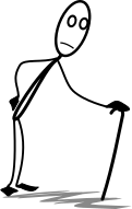 This features a black and white illustration of an old person walking with a cane. The individual is facing right, giving the impression that they are looking to their left. They appear to be in motion, possibly walking down a street or sidewalk. The illustration captures the essence of an elderly person navigating through life while using a walking aid for support.