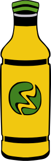 This features a yellow bottle with a green cap and label. The bottle is prominently displayed in the foreground, while the background appears to be a plain white color. The bottle's design suggests that it may contain some type of sauce or condiment, as it has a circular green label on its surface. This unique combination of colors and design elements creates an eye-catching visual effect that draws attention to the bottle itself.