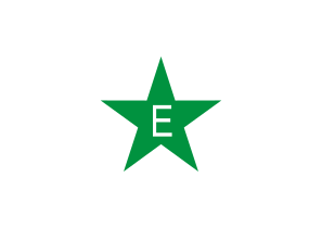 This features a green and white star with the letter "E" in the center. This symbol is likely associated with Esperanto, a constructed language that was created to promote international understanding and communication among people of different nations. The star serves as an emblem for this language, representing its values and principles. The color scheme of green and white adds a sense of freshness and simplicity to the design, making it easily recognizable and memorable.