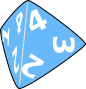 This features a blue die with the numbers 1, 4, and 3 on it. The die is placed in the center of the image, occupying most of the frame. The colors used for this die are predominantly blue, giving it a vibrant appearance. This could be an illustration or a real object, but regardless, it showcases a unique design with numbers and colors that make it visually appealing.