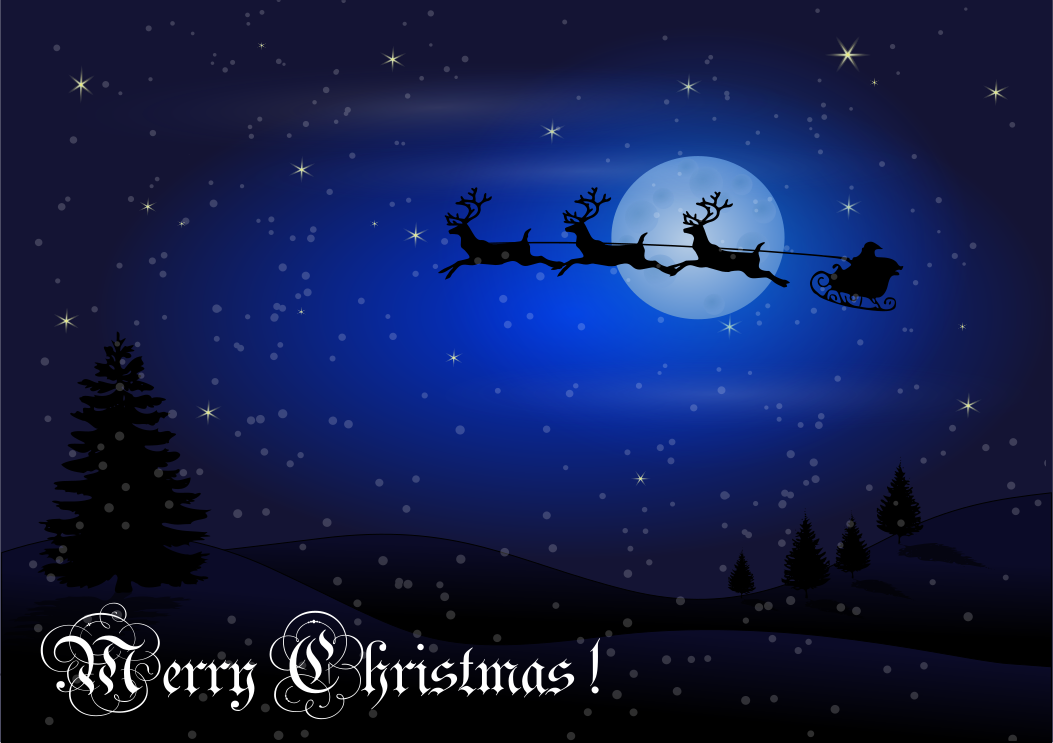 This features a night scene with Santa Claus riding his sleigh through the sky. He is accompanied by reindeer, and they are all flying above a snowy landscape. The sky is filled with stars, creating a beautiful backdrop for this festive scene. In addition to the main focus on Santa and his reindeer, there are also two pine trees visible in the image, adding to the holiday atmosphere.