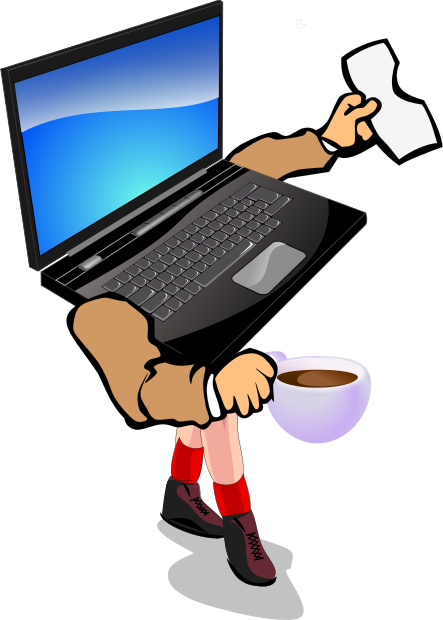 This features a creative and whimsical illustration of a laptop computer. In this drawing, the laptop is depicted as having human-like legs and arms, giving it a unique appearance. It holds a paper in one hand and a coffee cup in the other, adding to its realistic portrayal. The screen of the laptop is blue, which adds to the overall color scheme of the image. This imaginative representation of a computer as a human-like figure showcases the artist's creativity and ability to bring an unconventional twist to everyday objects.
