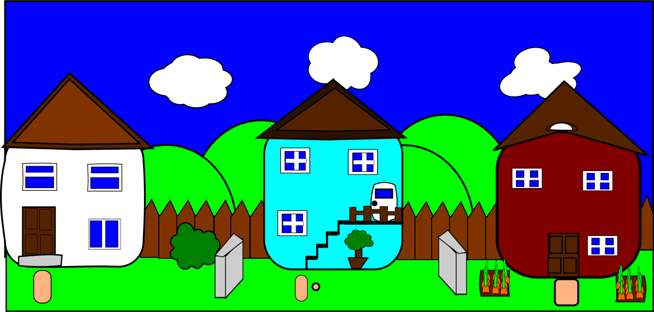 This features a cartoon-like scene of two houses, one blue and the other brown. Both houses have stairs leading to their second floor. In front of the blue house, there is a small tree with a bird perched on it. A potted plant can be seen near the right side of the image. The overall atmosphere appears to be calm and peaceful, as if taken from a children's storybook or a comic strip.