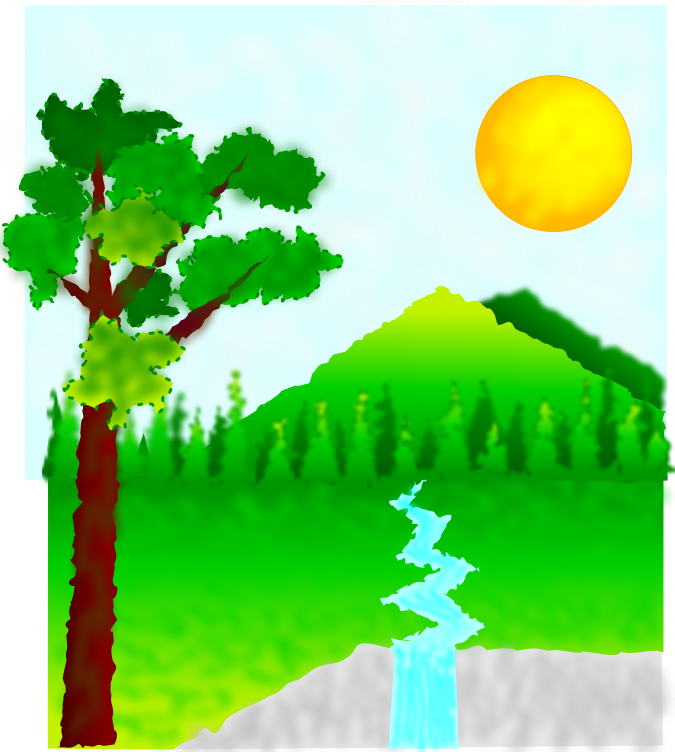 This features a beautiful landscape with a tall tree situated in the foreground. In the background, there are green mountains that create a picturesque scene. A stream of water can be seen flowing through the valley, adding to the serene atmosphere. The sun is shining brightly in the sky, casting its warm glow over the entire landscape. This artistic representation captures the essence of nature and tranquility.