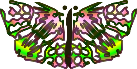 This features a colorful butterfly with green, pink, and yellow wings. It appears to be an artistic representation of the insect, possibly created by someone in their youth. The butterfly's wings are spread out, showcasing its vibrant colors and intricate patterns. The design is reminiscent of a kaleidoscope, adding a sense of depth and visual interest to the image.