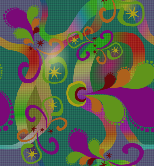 This features a colorful and vibrant design with various shapes, including stars and swirls. These elements are combined to create an eye-catching pattern that is reminiscent of a kaleidoscope. The colors used in the design are predominantly shades of green, purple, orange, yellow, and pink, creating a lively atmosphere. The overall effect is a visually appealing and dynamic background that can be used for various purposes such as wallpaper or decoration.