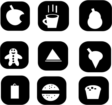 This features a collection of black and white icons representing various food items. There are several apples, with one in the top left corner, another in the middle right, and two more in the bottom left area. A cup can be seen in the upper center part of the image, while an apple is also located near the top right corner. In addition to these icons, there are a few other items scattered throughout the collection. A donut is present in the lower middle section, and two sandwiches can be found on the bottom left side. There's also a bowl situated towards the center of the image, and an orange located near the top right corner. The overall arrangement creates a visually appealing display of food-related icons.