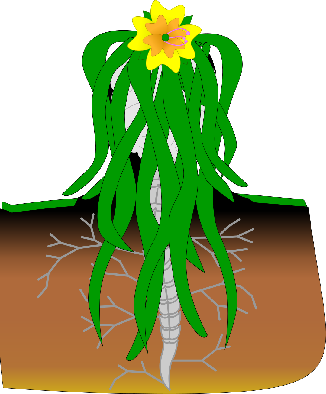 This features a plant with a yellow flower at the top, growing out of an orange and brown soil. The plant has long green leaves that are spreading out from the center, giving it a unique appearance. The flower is situated in the middle of the plant, adding to its visual appeal. The combination of the vibrant yellow flower and the earthy tones of the soil create a striking contrast within the image.