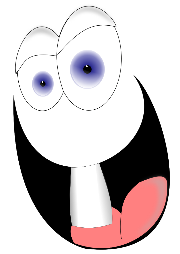 This features a cartoon character with a big smile and two blue eyes. It appears to be an animated drawing, possibly from a children's show or movie. The character has a mouth that is open wide, giving the impression of being happy and carefree. The character's facial expression suggests it might be a friendly and approachable figure for young viewers.