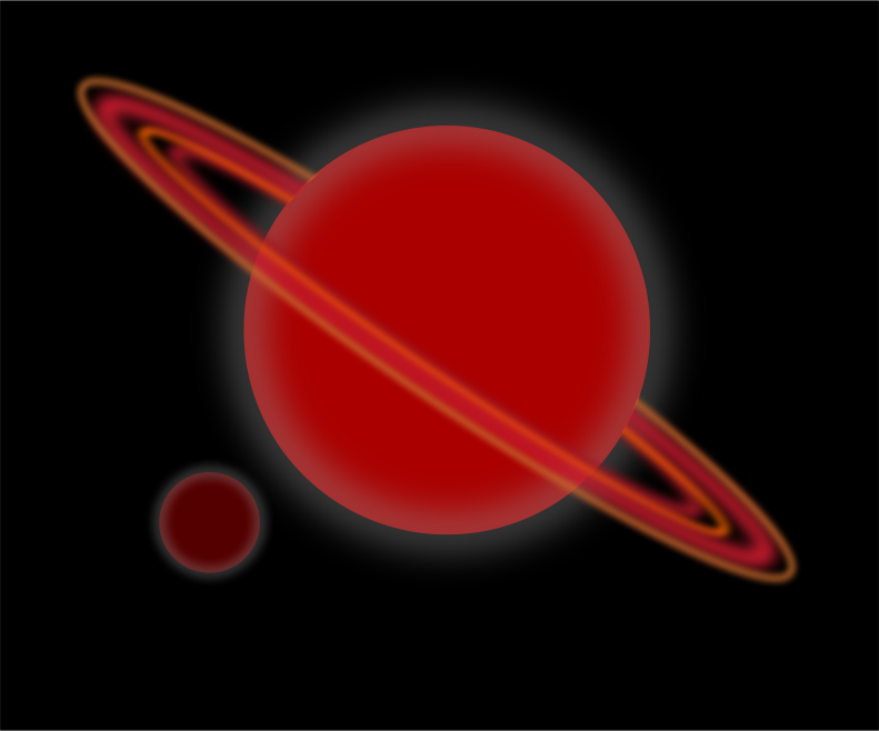 This features a red planet with a large, round appearance that resembles Saturn. It is positioned in the center of the scene and appears to be the main focus of the image. Surrounding this prominent planet are several smaller celestial bodies, including two moons located on either side of it. The moons have distinct shapes and sizes, adding depth and interest to the overall composition of the image.