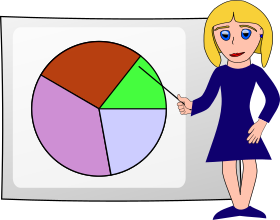 This features a woman standing in front of a white board, pointing at a pie chart. She is wearing a blue dress and has blonde hair. The pie chart displays various segments, including one that reads "100%." The woman appears to be giving a presentation or lecture on the subject matter depicted by the pie chart.