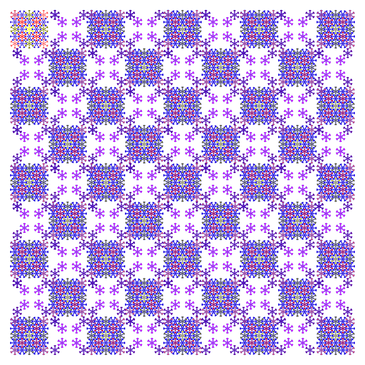 This features a large, intricate design made up of many small squares. Each square is filled with a pattern that resembles a chessboard or a mosaic tile. The overall effect is a visually striking and complex pattern that covers the entirety of the image. The colors used in this design are predominantly purple, creating a rich and vibrant appearance. This artistic piece could be used as a wallpaper, fabric print, or even as part of an interior decoration scheme.