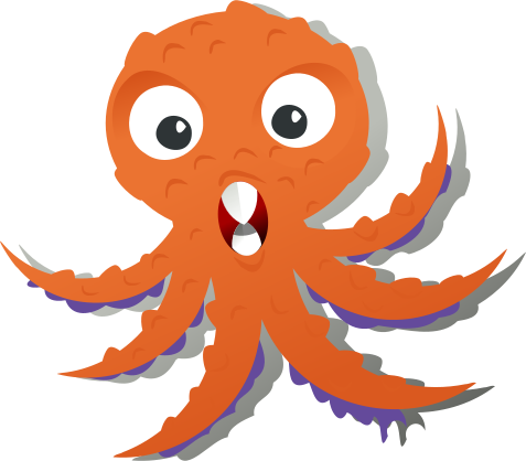 This features a cartoonish orange octopus with big eyes and only two teeth. It appears to be surprised, as if it has just been caught in the act of opening its mouth wide. The octopus is depicted with six tentacles, which are spread out around its body. Its facial expression gives off a playful and humorous vibe, making it an entertaining visual for viewers.