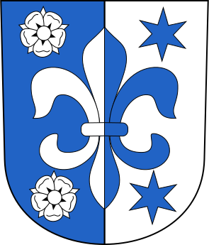 This features a blue and white coat of arms, with the blue section being larger than the white. The design includes a blue cross on top of a white star, surrounded by several blue flowers. The coat of arms is adorned with a total of 13 blue flowers, which are scattered throughout the design in various positions. This intricate and colorful emblem showcases a sense of pride and heritage.