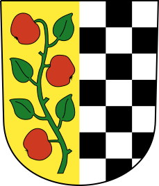 This features a coat of arms with a yellow and black checkered pattern. In the center, there is an apple tree with red apples growing on it. The leaves are green, and they surround the apples in various positions. There are at least 12 visible apples scattered throughout the scene, some closer to the top while others are nearer to the bottom of the image. This coat of arms design showcases a sense of pride and heritage through its use of the apple tree as a symbol.