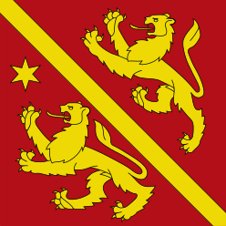This features a red flag with two yellow lions on it. Each lion is holding onto the flag, creating an impressive display of strength and power. The lions are positioned in such a way that they appear to be clawing at the flag, adding an element of aggression to their appearance. The overall design of the flag gives off a sense of authority and dominance, making it an eye-catching symbol.