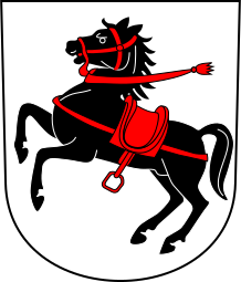 This features a black horse with a red saddle, which is the central focus of the scene. The horse appears to be galloping or running, as it is depicted in motion. The saddle on the horse's back adds an interesting detail and contrast to the overall design. This could potentially represent a coat of arms, showcasing the strength and grace of the horse while also highlighting its unique features through the red saddle.