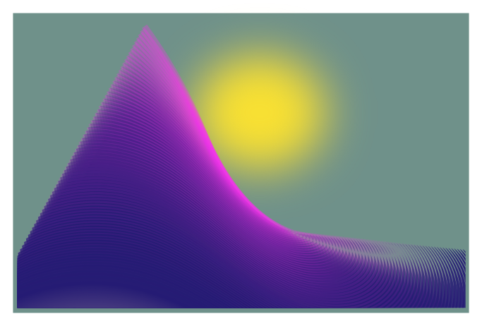 This features a purple mountain with a yellow sun in the middle of it. The sky is gray, creating an interesting contrast between the vibrant colors of the mountain and the sun. The sun appears to be rising or setting behind the mountain, casting its warm light on the scene. This unique combination of colors and lighting creates a visually striking image that captures the beauty of nature.