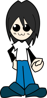This features a cartoon character with black hair, wearing a white shirt and blue jeans. This character appears to be a young man or boy, possibly drawn in a comic book style. He is holding a remote control in his hand, which adds an element of playfulness to the scene. The overall appearance of the cartoon character gives off a sense of fun and lightheartedness.