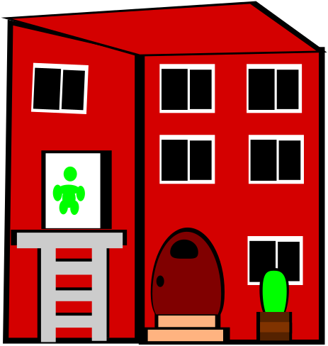 This features a red house with a large window and a door. Above the door, there is a picture of a person in a green shirt. In front of the building, there are two potted plants, one on the left side and another on the right side. Additionally, there is a small round door located near the center of the house. The overall scene gives an impression of a cozy living space with some decorative elements outside.
