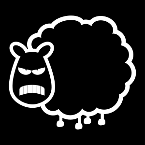 This features a black and white sheep with an angry face, standing in front of a cloudy sky. The sheep has a white outline around it, making it stand out against the dark background. Its expression appears to be quite menacing as it stares into the distance. This unique design could be used for various purposes such as a logo or an illustration, capturing attention and evoking emotions in viewers.