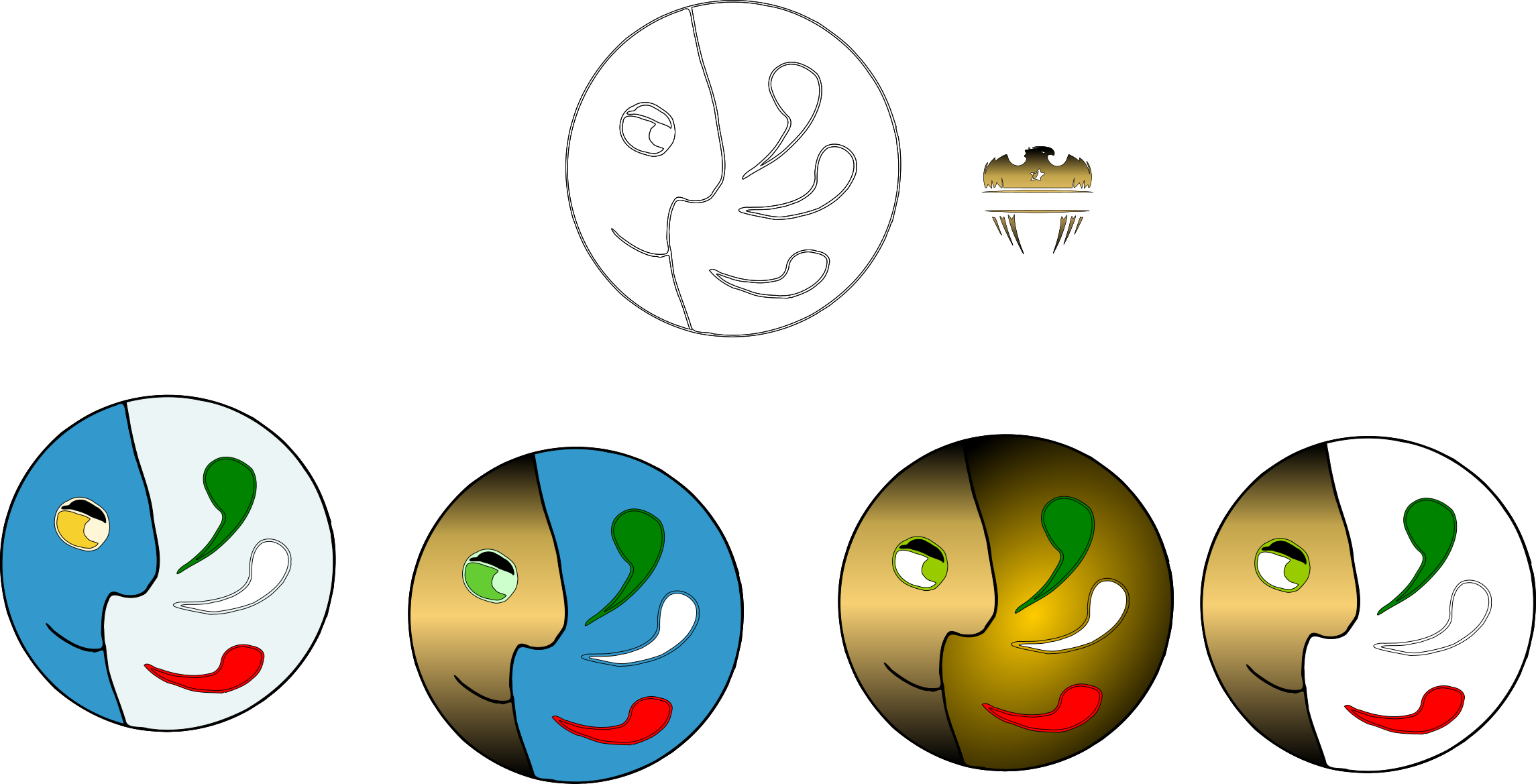 This features a row of five colorful, round objects with faces drawn on them. These objects are arranged in a line and each one has a unique expression. They appear to be made from different materials such as wood or metal, giving the impression that they might be crafted by hand. The colors used for these objects include blue, yellow, green, red, and white, adding variety to their appearance. Overall, this image showcases an artistic display of creativity and craftsmanship in creating these unique, colorful faces.