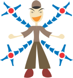This features a cartoon man with arms that look like spider legs. He is wearing a brown shirt and has a smiling expression on his face. His arms are positioned in various directions, giving the impression of multiple limbs. In addition to his unique arms, he also has a hat on his head, adding to his distinctive appearance. The man's facial features and overall design make him appear friendly and approachable despite his unusual physical attributes.