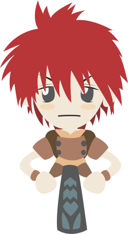This features a cartoon character with red hair and an angry expression. This character is wearing a brown outfit, possibly resembling a knight's attire. The character appears to be standing in front of a wall or background, giving the impression that they are posing for a picture. The overall design of the character suggests a fantasy setting, with their unique appearance and costume.