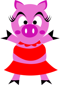 This features a pink cartoon character, resembling a pig with large eyes and a red dress. This character is standing on two legs, giving the impression of being in motion or posing for a picture. The pig's outfit consists of a red dress that extends down to its feet, adding a touch of elegance to the overall design. The character appears to be smiling, further enhancing its friendly and approachable demeanor.