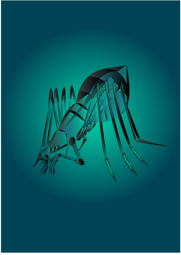 This features a large, blue insect with long antennae and legs. It appears to be an artistic representation of the creature, possibly resembling a horse or a dragonfly. The insect's body is positioned in the center of the scene, while its legs are spread out towards the edges. The overall composition creates a striking visual effect that captures the viewer's attention.