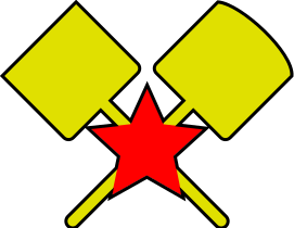 This features a yellow hammer and sickle emblem, which is the symbol of communism. The emblem consists of two yellow hammers placed on top of each other, with one slightly overlapping the other. A red star is also present in the middle of the emblem, adding to its distinctive appearance. This symbol has been used by various countries and organizations throughout history as a representation of their political ideologies or affiliations. The yellow color of the hammer and sickle adds a unique touch to the classic red and black design, making it stand out even more.