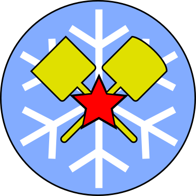 This features a blue circle with a yellow hammer and a red star in the center. The hammer is positioned on the left side of the circle, while the star is located towards the right. There are several snowflakes surrounding these two objects, creating an interesting visual effect. The combination of the yellow hammer, red star, and snowflakes gives the image a unique and eye-catching appearance.