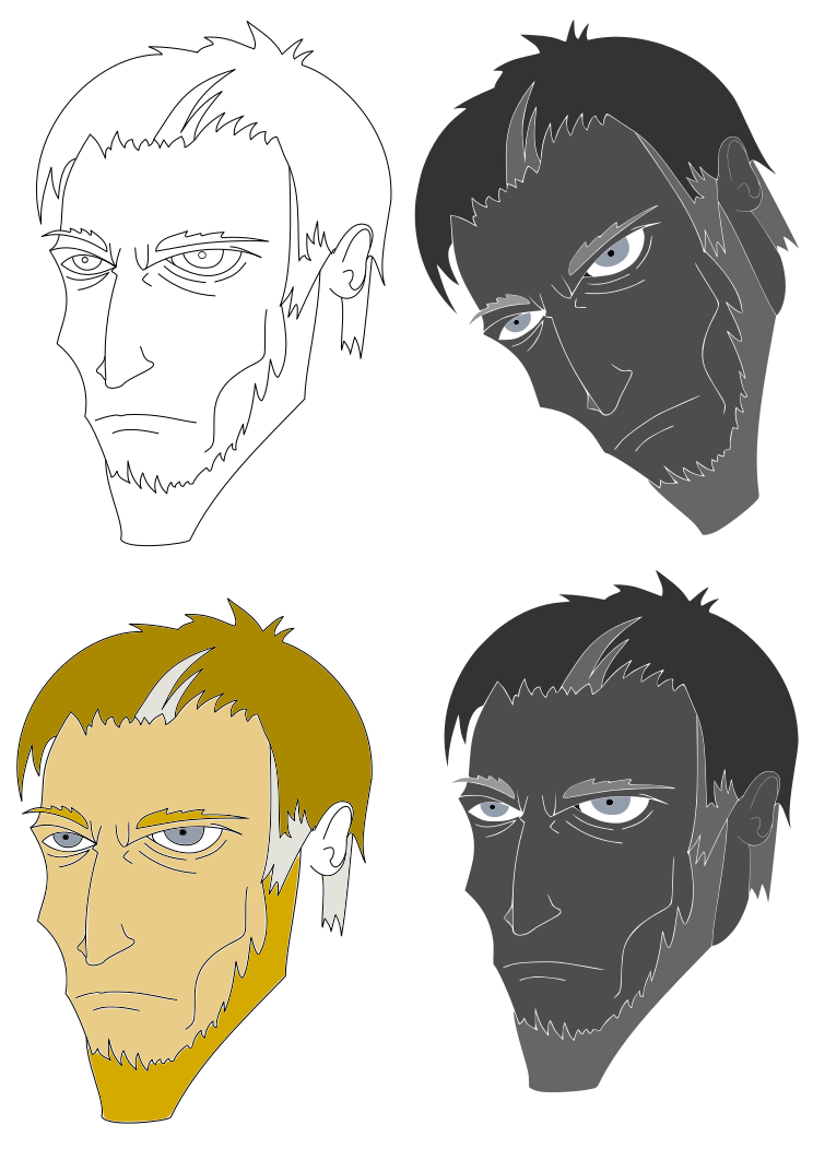 This features four distinct faces, each with a unique appearance. In the top left corner of the image, there is only a black outline of a face, while in the right side of the image, two gray-colored faces are visible. On the bottom left, an orange-colored face stands out among the other three faces. The four faces are arranged in a row, showcasing their individual characteristics and differences.