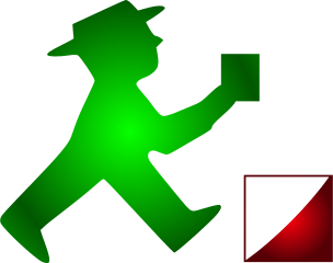 This features a green man walking towards a square that is half colored in red. He appears to be wearing a hat and carrying a book, giving the impression of a traveler or someone on a journey. The man's figure is prominently displayed in the scene, with his body positioned towards the right side of the image. The red square adds an interesting contrasting element to the overall composition of the picture.