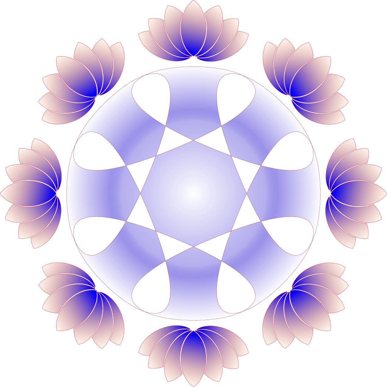 This features a beautifully designed blue and pink lotus flower, which is the central focus of the artwork. Surrounding this main flower are several smaller, intricately crafted lotus flowers in various shades of pink and blue. These smaller flowers are arranged around the main one, creating an eye-catching pattern that showcases the artist's skillful work. The overall composition of the image is visually appealing and captivating, with each flower adding a unique touch to the design.