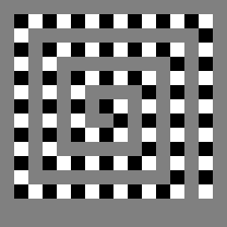 This is a square with a checkered pattern, featuring black and white squares. It appears to be a close-up of the pattern, possibly from an artistic or design perspective. The pattern creates a visually interesting and somewhat complex appearance, as if one were in the center of a maze but could easily find their way out.