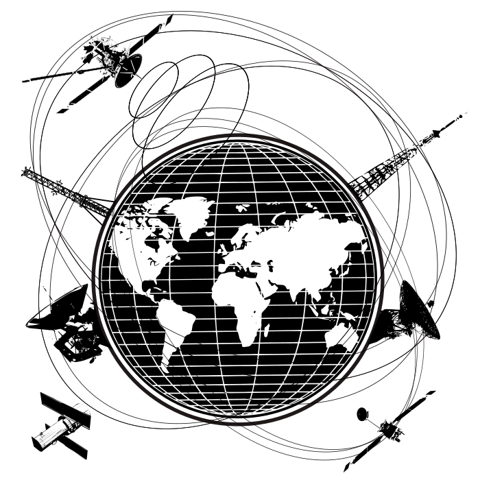 This features a black and white globe of the world, with various objects surrounding it. These objects include several spacecrafts such as rockets and satellites, as well as other items like a cell phone and a TV antenna. The globe is surrounded by these objects, creating an interesting visual representation of the interconnectedness of communication systems around the world. The image showcases how technology has become an integral part of our daily lives, with devices such as satellites and rockets playing crucial roles in communication and exploration.