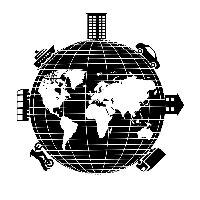 This features a black and white globe of the world, with various transportation symbols such as cars, trucks, trains, airplanes, ships, and even a suitcase. These symbols are scattered across the globe, indicating different modes of transportation in each region. The globe is surrounded by buildings, giving an impression of a busy urban environment. The image also includes a few people, likely representing the population of various countries or regions on the globe. This adds to the overall representation of diverse cultures and lifestyles around the world. Overall, the image showcases the interconnectedness of different transportation methods and their impact on global travel and communication.